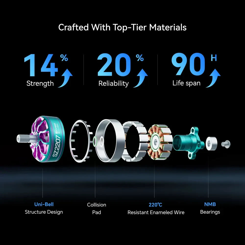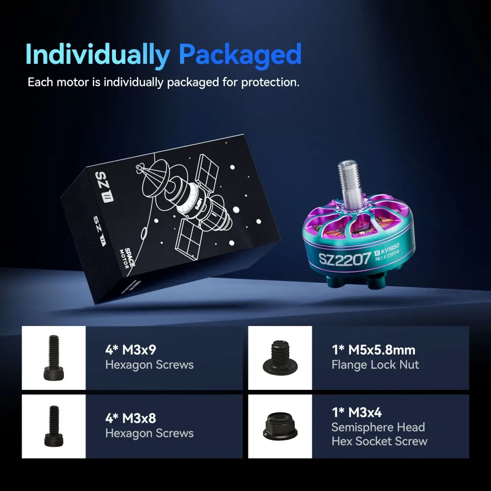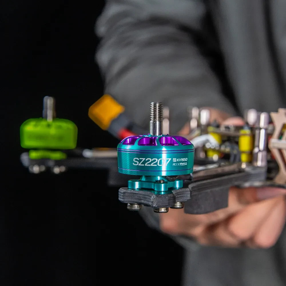 The SZ2207 motor is designed to maximize energy efficiency, providing powerful, stable output that extends flight time and enhances performance. Its optimized power system supports rapid acceleration while maintaining smooth, reliable power throughout the race, allowing pilots to focus on their flight and sustain high speeds with confidence, gaining a competitive edge from start to finish.