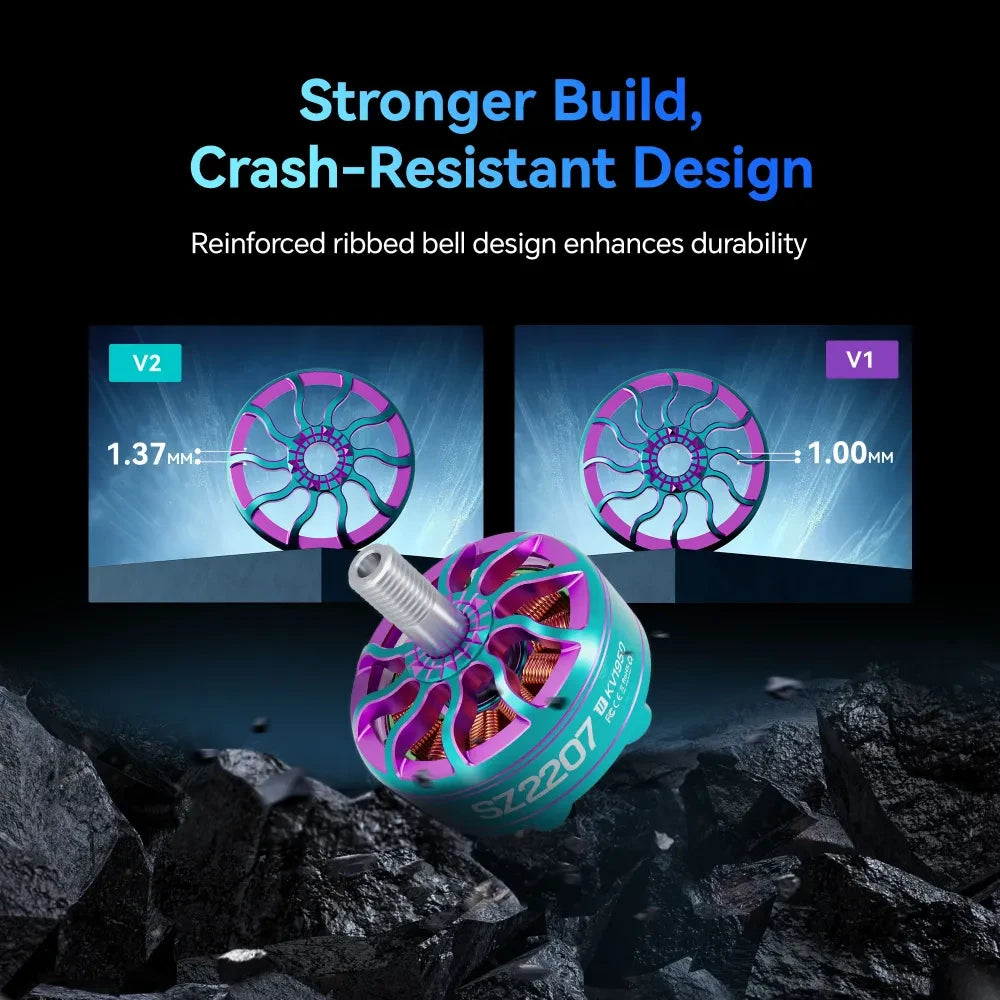 The SZ2207 second-generation motor features fewer but thicker arms than first-generation, improving impact resistance without compromising on weight. This design enhances the motor’s crash resistance, allowing it to withstand the intense demands of high-speed racing and aggressive freestyle flying, giving pilots greater confidence and reliability in challenging maneuvers.